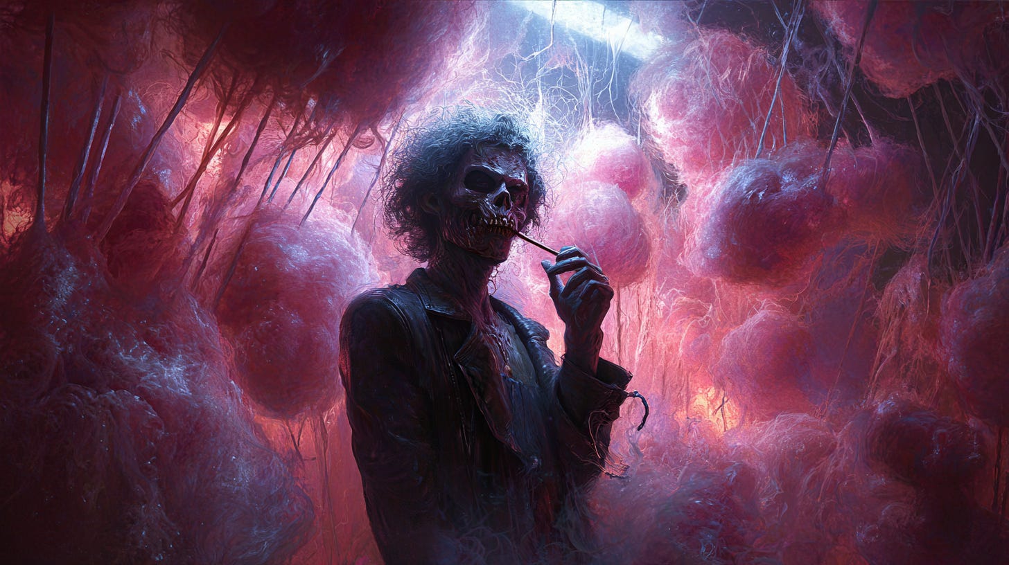As the world spins around me, I see the cotton candy vendor grinning at me as he motions like an angler hauling in a catch. I feel myself inexorably pulled toward him as I drift through the crowd to what is surely my impending brutal death.