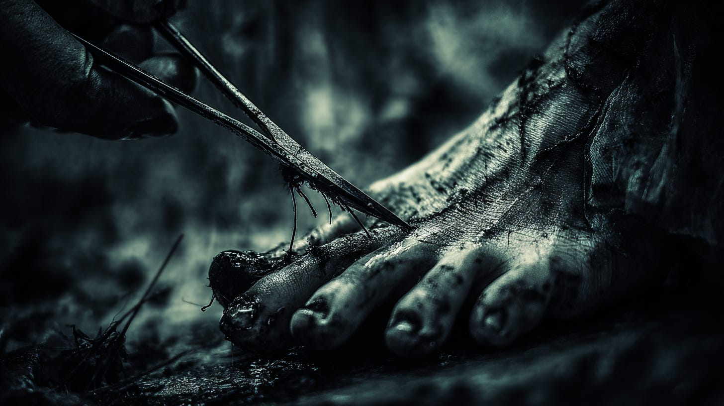 The first of the murderers lay still, dead from the wounds inflicted upon him. Richard used his surgical skills to remove the skin from the dead man’s feet in a pair of single pieces. Removing his shoes and socks, he slipped into the skin and began to pace the room.