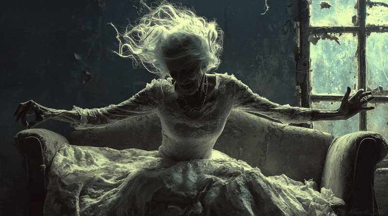 I feel myself emerge from the torpor of open-eyed slumber and my fabric sighs as we lift off the floor, the flowered wallpaper coming to life in a burst of radiant color, the dancing flora seeming to join us in our ascent. She raises Her hands as we hover above the weathered rug and, for the merest of moments, we rejoice in the glory of forever, of promises kept and dreams come true, and then we drop, and I find that I am destined to hang forevermore.