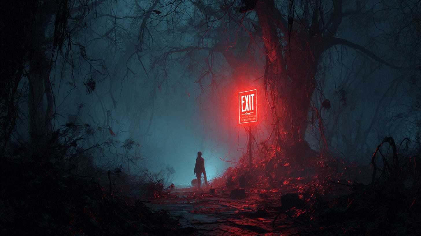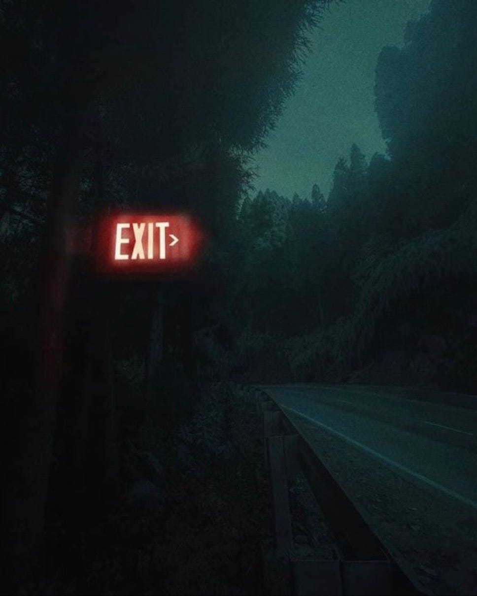 I float toward the end of my country cabin driveway, as I do every day, only this time there is a hum and a red glow. An exit sign is there, pointing toward an unknown destination.