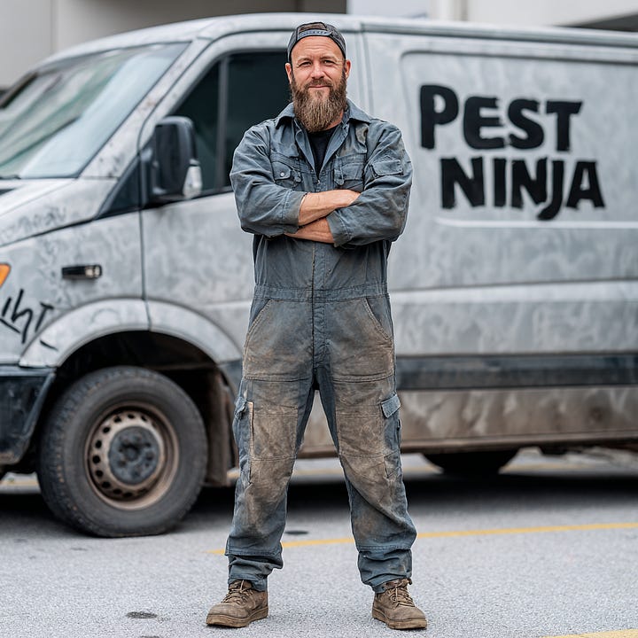 Eric sat on his couch, watching the man work and trying to resist the urge to grab him and toss him out on the street. The Pest Ninja website had promised professional removal of all household invaders, but the guy they had sent was a walking disaster, tripping over himself and looking generally unkempt. In fact, he was the complete opposite of a ninja.