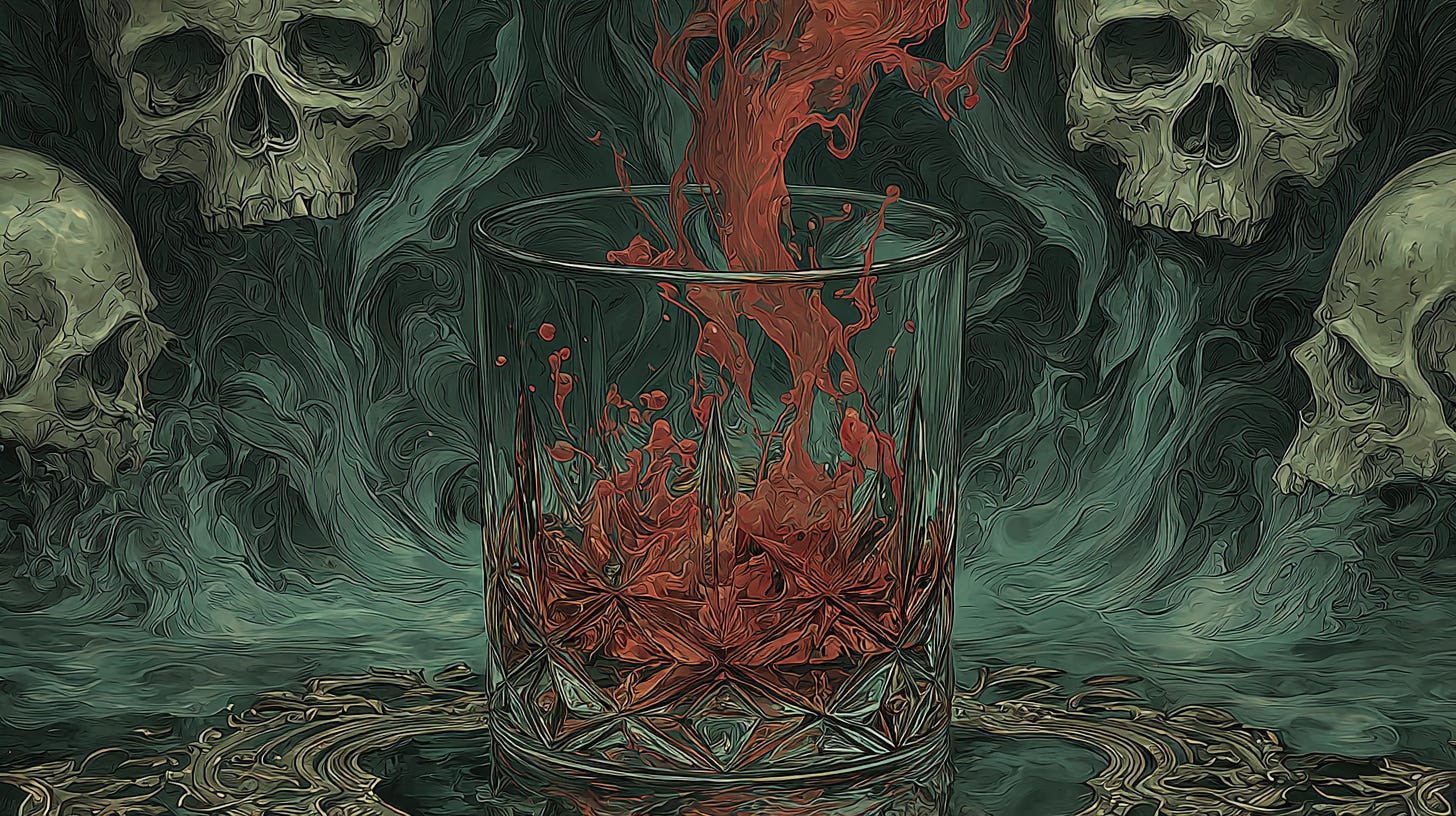 Tipping the glass back, he swallowed the shot and shuddered as the alcohol bloomed in his chest. He considered pouring another round from the bottle of “Poet’s Blood,” but best not to overindulge.