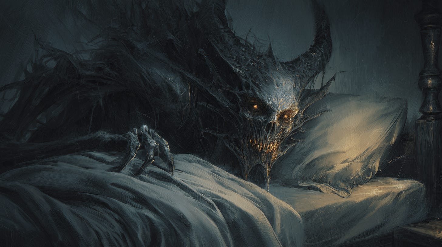 My wife has had issues with sleep paralysis, particularly in her younger years, and the whole thing terrifies me. In Germany, there is a sleep demon called the Alp that loves to come and sit on the chest of people who are asleep, causing them to have nightmares that are difficult to wake up from. The creature is often invisible, but when it does appear, it is described as having an elflike appearance, although it can also shift into different animals. All this time, I thought it was my cat sitting on my chest.