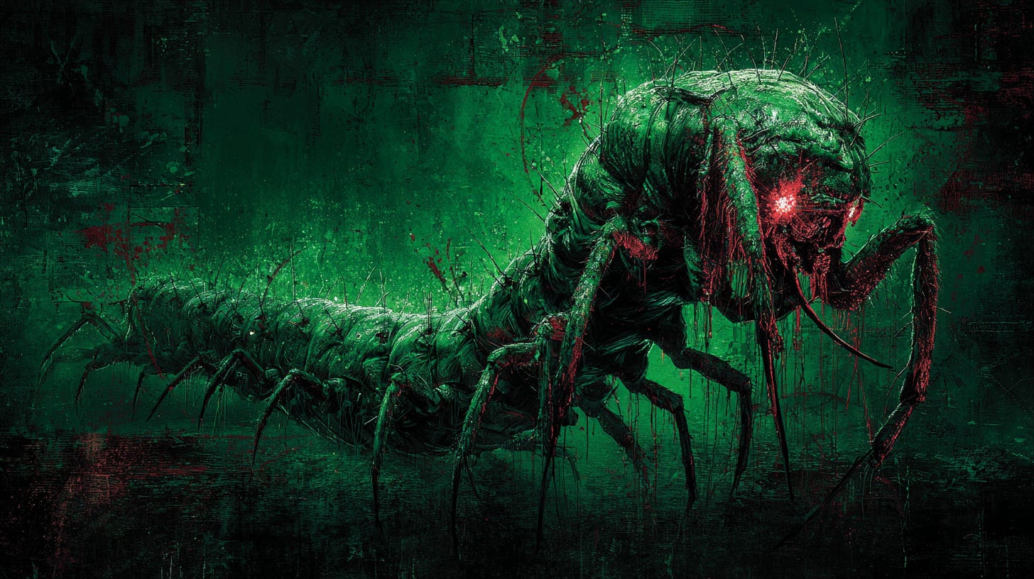 After the third attempt, Sam pitched a fit, stood, and stomped on the centipede. The blood burned through the rubber sole and on through the flesh, hungry for more.